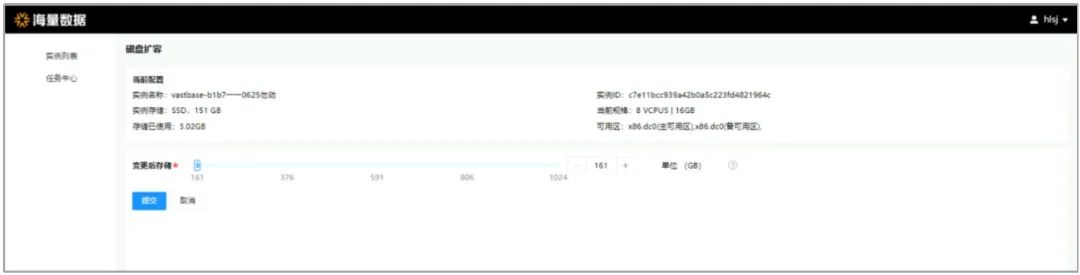 以华为云适配版本为例,点击实例名称,进入实例详情页。点击连接信息中的“磁盘扩容”按钮,可以对Vastbase实例的存储空间进行扩容,扩容后不会重启实例。