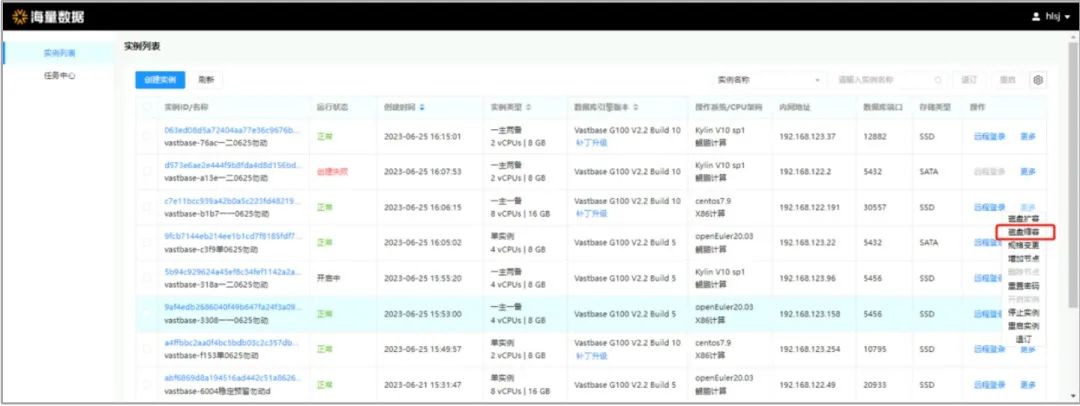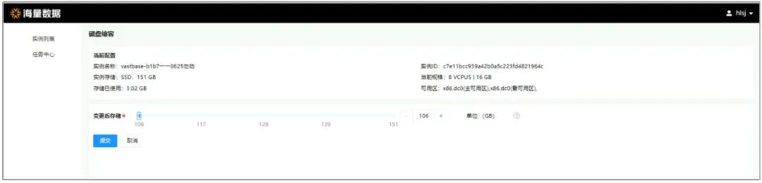 以华为云适配版本为例,在“实例列表”页面,选择目标实例,单击“操作”列下“更多”按钮 >“磁盘缩容”,可以对Vastbase实例的存储空间进行缩容。