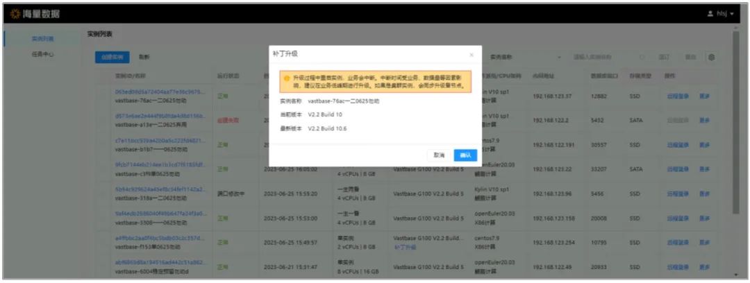 以华为云适配版本为例,在“实例列表”页面,若有可以升级补丁版本的实例,则数据库引擎版本列会显示“补丁升级”,点击“补丁升级”按钮弹出升级弹窗,展示当前版本和可升级最新版本,点击“确认”即可开始升级。补丁升级过程中实例状态显示为“补丁升级中”。