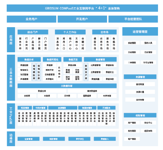 GRIDSUM COMPaaS是依托国双大数据、人工智能、边缘计算等技术能力,自主可控的企业级计算平台。历经20余次版本迭代,平台现包含28个主模块、200余项平台能力、30万个+智能模型、10亿+图谱知识节点、能够支持TB级日常数据流转、赋能120多个行业场景、服务大中型企业超100家、累计稳定运行24000多小时,具备“边缘数据和海量异构数据汇集与建模分析、新型工业软件开发与运行、数字孪生还原生产现场、拖拽式报表与大屏展示、一站式运营管理”等能力。