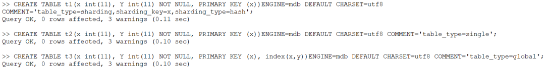 第一步:分别创建一张sharding表t1、single表t2和global表t3.