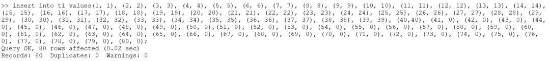 第二步:在每张表中插入相同的80条数据,以t1表为例: