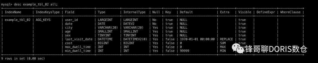 表中的列按照是否设置了 IndexKeysType 是 AGG_KEYS 表示是聚合模型,分为 Key (维度列) 和 Value(指标列)。