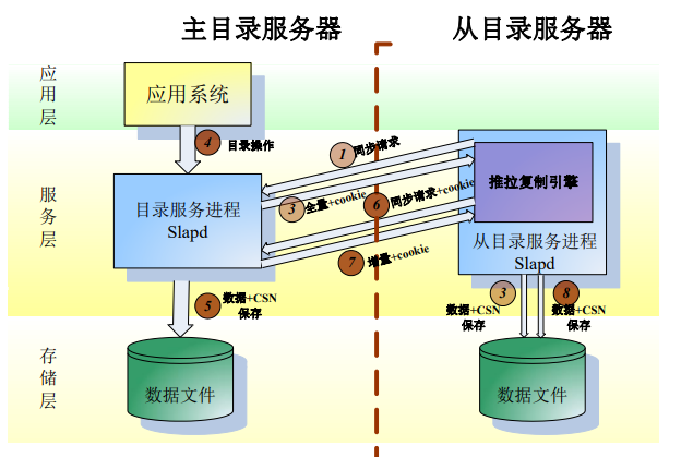 GBase 8d 还支持推拉复制模式,该模式使用同步复制引擎,这是一个消费 方的复制引擎,能让消费者服务器维护一个目录树片断的影子副本。同步复制 引擎驻留在消费者端,并以 slapd 的一个线程的方式运行,它通过连接一个复 制提供者,执行初始化目录树内容,以及随后定期进行内容检测或实时根据内 容变更进行更新,来建立和维护一个消费者复制。 推拉复制采用了 RFC4533 中的参考建议,是基于 CSN 方式实现的。该方式 无须维护历史信息(如:变化日志、状态快照等),它是依赖于当前目录状态 和嵌入到同步 cookie 中的同步状态信息来实现的。 原理示意图如下: