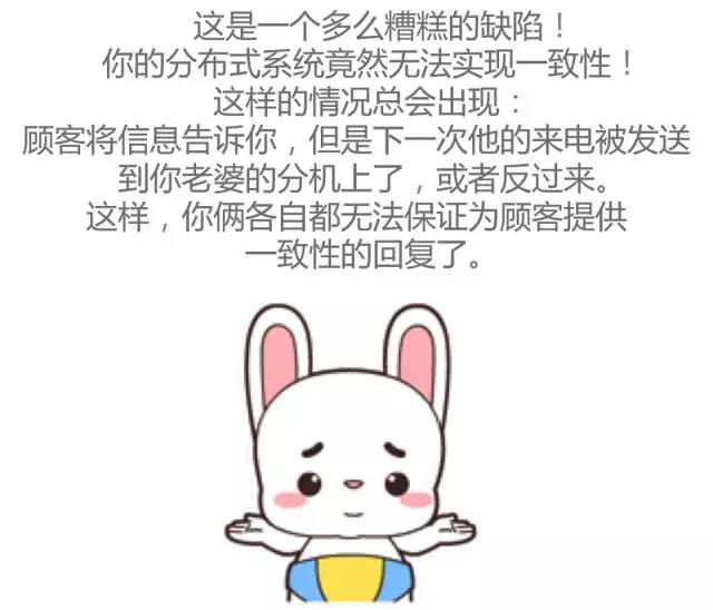 一切进行得很顺利。A君的分布式系统不仅完美展示着“一致性”,而且即使哪天他们两人中有一个放假休息,公司运作丝毫无影响。但是有天老婆大人生气了!即使两人都在开工,她接到了顾客要求记录信息的电话,却因为生闷气,决定这一天都不告诉A君“更新“信息。这下完蛋了!到目前为止,一直保持“一致性”和“可用性”的完美系统却因为没有“分区容错性”瞬间崩溃!于是A君决定哄好老婆大人之前,他自己这边不接任何顾客电话,于是在这段时间内,整个系统是失去“可用性”保障的。