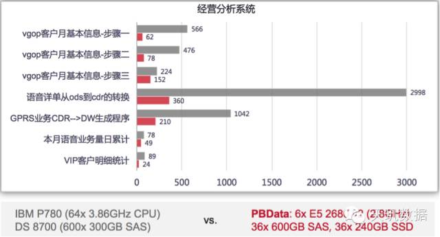 下为天玑数据的PBData数据库云平台(3节点配置)在某用户经分主仓系统中进行数据测试时,与传统小型机加高端磁盘阵列构成的传统架构性能测试对比结果: