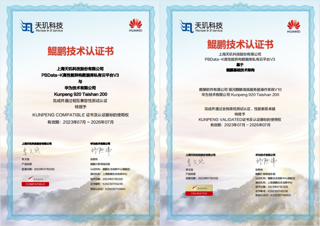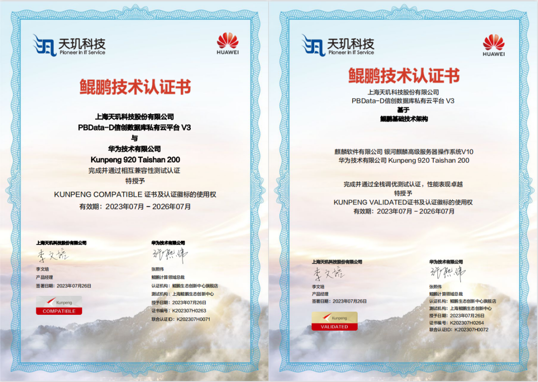 近日,经过多项严格测试评估,由天玑数据自主研发的“PhegData-X分布式存储软件”、“PBData-K高性能异构数据库私有云平台”、“PBData-D信创数据库私有云平台”三款产品成功获得华为鲲鹏Validated、Compatible双认证。