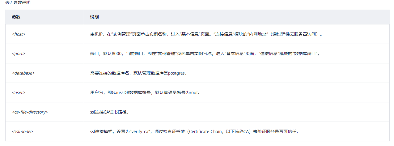 postgres为需要连接的数据库名称,10.0.0.0分布式为CN的IP地址,主备版为主DN的IP地址,root为登录数据库的用户名,8000为CN或主DN的端口号。