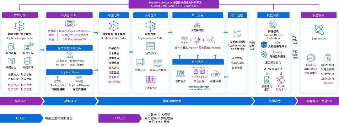 数据为中心的人工智能:Sophon LLMOps平台将高质量、丰富多样的数据作为实现生产级别大模型的基础。它融合了自研的向量/文本/图数据库以及分布式文件系统、数据处理和数据中台以及智能分析工具,可以统一管理、分析和应用智能分析前、中、后的多来源、多模态的数据。这有助于用户解决数据的采集整合、处理清洗、标注增强、提示生成、提示评估、业务效果对齐等问题,从而缩短业务落地观察周期,加速业务提升效果。