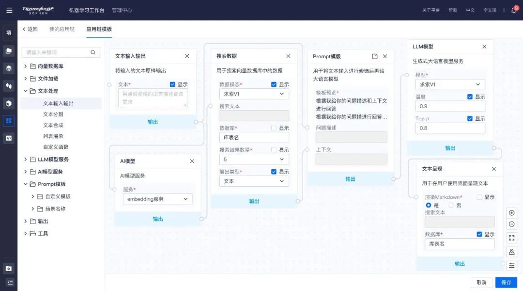 敏捷的应用链编排:Sophon LLMOps提供了应用和服务编排工具,使用户可以以低代码的方式结合知识库、智能分析和工具、代码执行器等技术和工具,通过向量数据库和深度图进行多模态意义下的“语义”检索、召回和串联来协同完成任务,提高从“需求到原型再到生产可用”的开发敏捷性和效率。