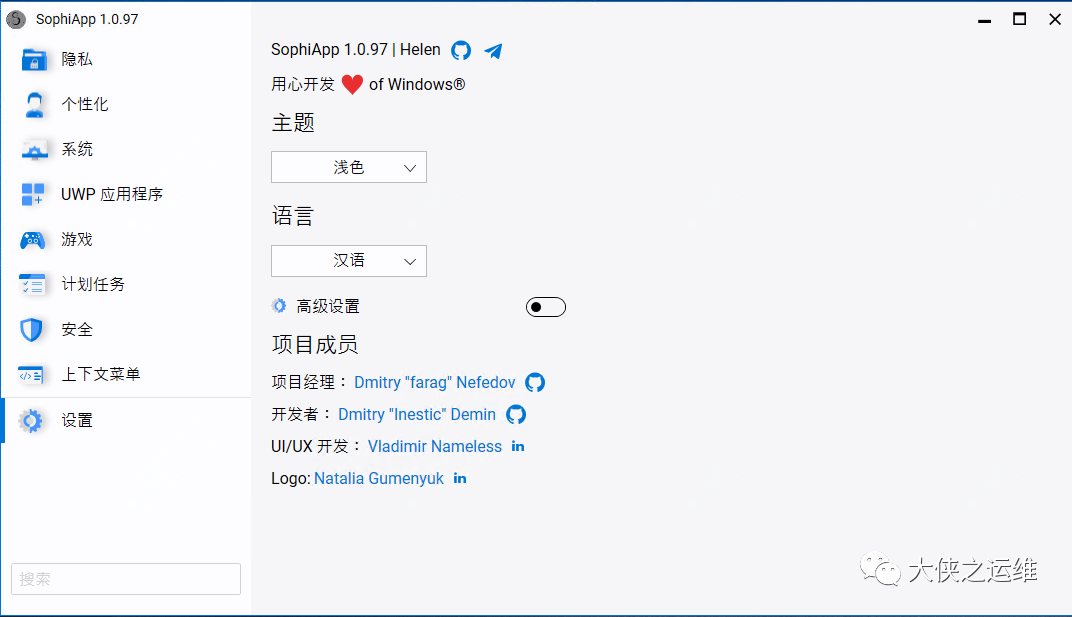 免费和开源。你可以在GitHub上查看和修改SophiApp的源代码,也可以为其贡献你的想法和建议。 现代和友好的UI/UX。你可以通过一个简洁和美观的用户界面来选择和应用各种调整选项,也可以根据你的喜好切换暗黑或明亮主题。 超过130个独特的调整。你可以配置Windows的隐私、安全、个性化、性能、清理等方面,提高你的系统效率和体验。 显示每个功能的当前状态。你可以一目了然地看到每个调整选项在你的系统上是开启还是关闭,也可以通过搜索功能来快速找到你想要的设置。 完全便携式。你不需要安装或卸载SophiApp,也不需要担心它会在注册表中留下任何痕迹。只需解压缩并运行SophiApp.exe即可。 静态分析器检查。SophiApp的代码经过了PVS-Studio提供的静态分析器的检查,以确保其质量和安全性。 云端编译。你可以在GitHub上比较压缩包的哈希值,以验证其完整性和真实性。 支持多语言。你可以通过修改或创建相应的.json和.xaml文件来将SophiApp的界面翻译成你喜欢的语言。