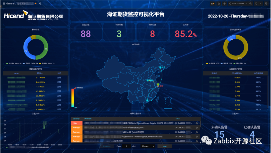 根据市场调研最终选择Zabbix+Grafana开源解决方案,结合原厂托底服务,Zabbix Server通过原生HA方式实现高可用。通过Zabbix实现操作系统、数据库、虚拟化和网络设备等对象监控,统一将Zabbix事件信息发送至第三方事件平台,网络拓扑图和其它一些主机视图通过Grafana配置查看。