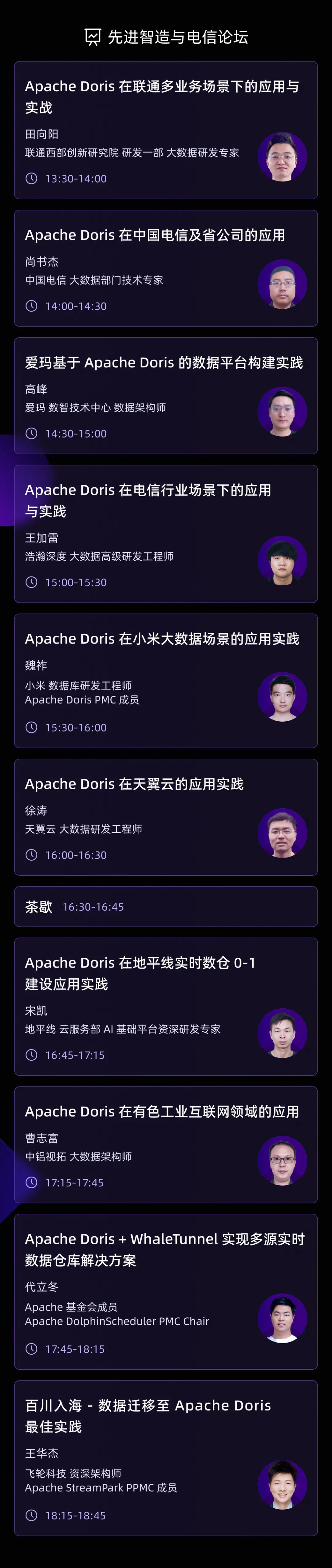 在 Doris Summit Asia 2023,来自美团、小米、中国邮政储蓄银行、中国电信、中国联通、网易、腾讯、平安、雨润、虎牙等众多行业创新者们将会分享基于 Apache Doris 的创新应用,我们也希望这些宝贵的实践经验可以被更多用户聆听,以技术交流和思维碰撞为所有用户带来更加深刻的启发。