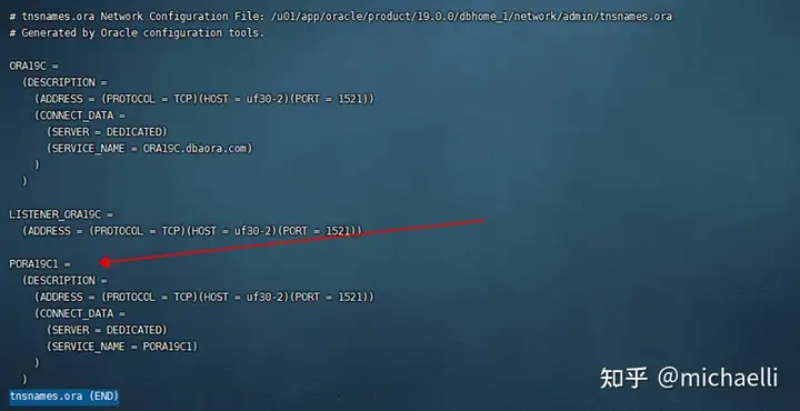 - 配置完毕的 tnsname.ora 内容如下,可见添加了对可插拔数据库实例 PORA19C1的监听配置(PORA19C1是通过配置文件dbca.rsp的配置项pdbName=PORA19C1指定的):