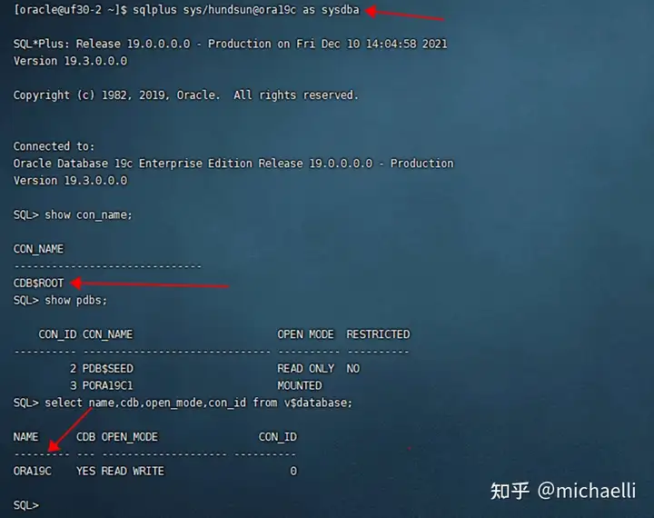 - 上述命令执行成功后,登录的是根容器 CDB$ROOT,若要切换到某个可插拔数据库 pdb,可以使用命令 alter session set container=pdbName;。