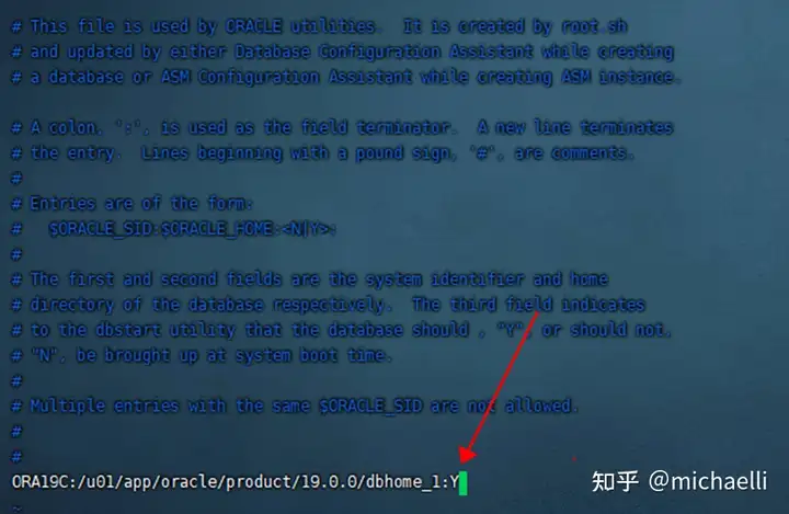 ORACLE_HOME:<N|Y>,其中第一部分为数据库实例的 SID 即 system identifier,第二部分为数据库实例的 home目录,第三部分指定通过命令 dbstart启动数据库时,该数据库实例是否自动启动; - 通过设置第三部分的 restart flag 为 'Y',即可实现该数据库实例随oracle系统启动的自启动: