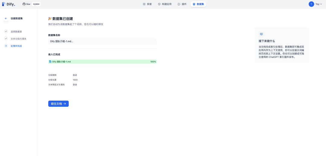 创建数据集,这里示例上传了【Dify 团队介绍】作为知识库数据。