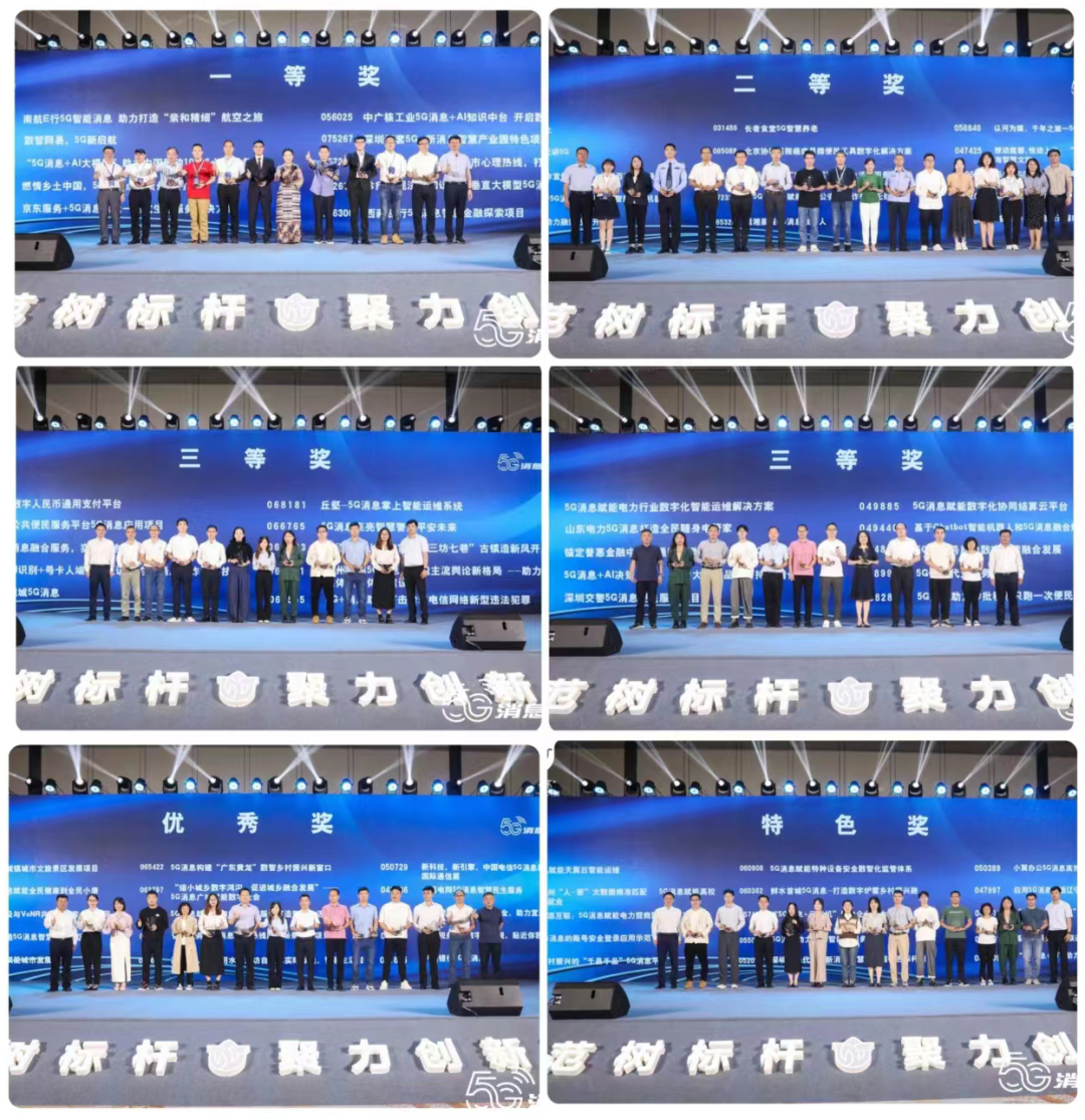 专题赛自6月底启动以来,共征集到来自全国各地的598个项目参赛,经项目查重和资格复审,有效项目497个。通过初赛、复赛、决赛的激烈角逐,最终评选出一等奖10项、二等奖15项、三等奖20项、优秀奖15项、特色奖15项。充分展示了5G消息与千行百业融合的无限可能,全面展现了近年5G消息产业推进的生动实践和丰硕成果。颁奖仪式上,工业和信息化部信息通信发展司、中国信通院、中国通信企业协会及基础电信企业领导为获奖项目颁奖。