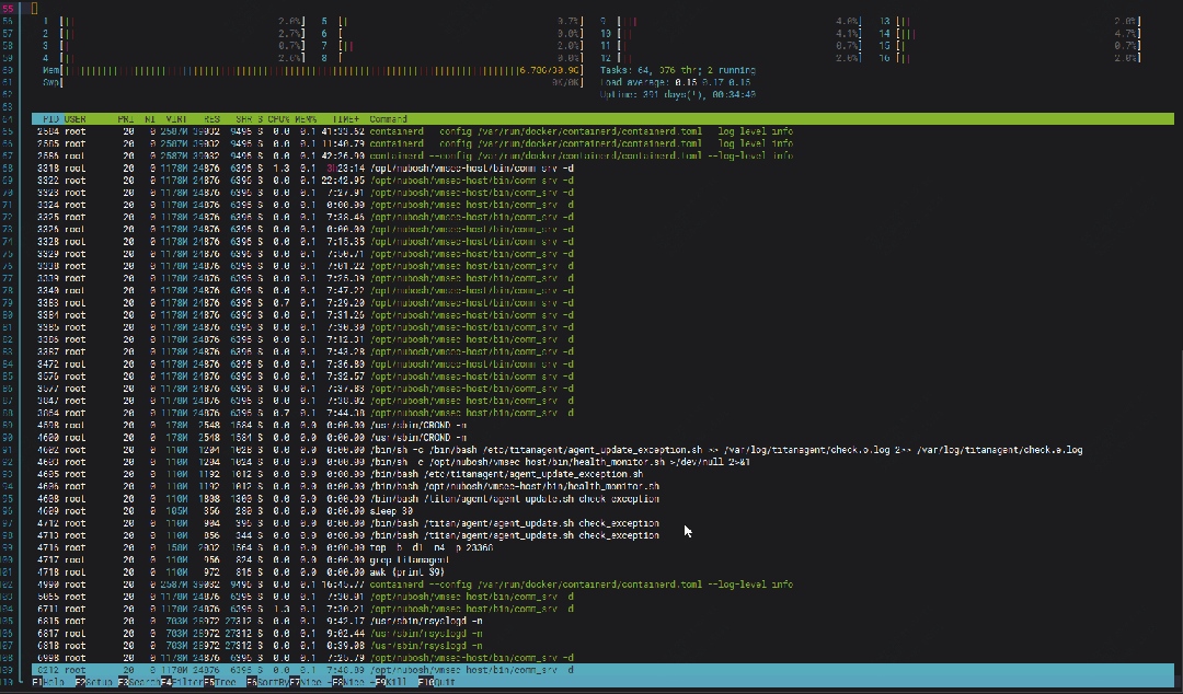 HTop是一个基于文本的、交互式的系统监视器。它提供了一个动态的、实时的视图,显示了系统上运行的进程、系统资源的使用情况以及各个进程的详细信息。HTop的界面友好,颜色鲜艳,提供了直观的图形化界面,使用户能够轻松地监视系统性能,发现问题和优化系统资源。