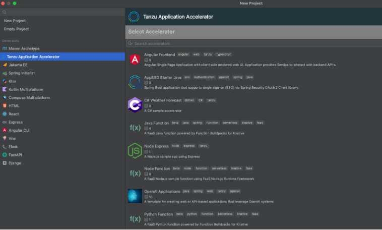 开发人员通常从 IDE Marketplace 安装 IDE 扩展。从这个版本开始,VMware Tanzu Developer Tools for VS Code 和 VMware Tanzu Application Accelerator for VS Code 将在 VS Code Marketplace 中提供。同样,VMware tansu IntelliJ 开发工具也将在 IntelliJ 市场中提供。开发人员可以在他们的 IDEs 中安装扩展,这可能是一种更熟悉的设置。
