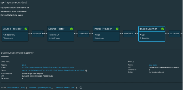 用户现在可以直接从 Tanzu 开发者门户(在Tanzu 开发人员门户供应链中,镜像扫描阶段)下载 CycloneDX 和 SPDX 格式的 SBOM。SBOM 由元数据存储生成,表示最新的 SBOM。此功能可实现更快的漏洞修复。