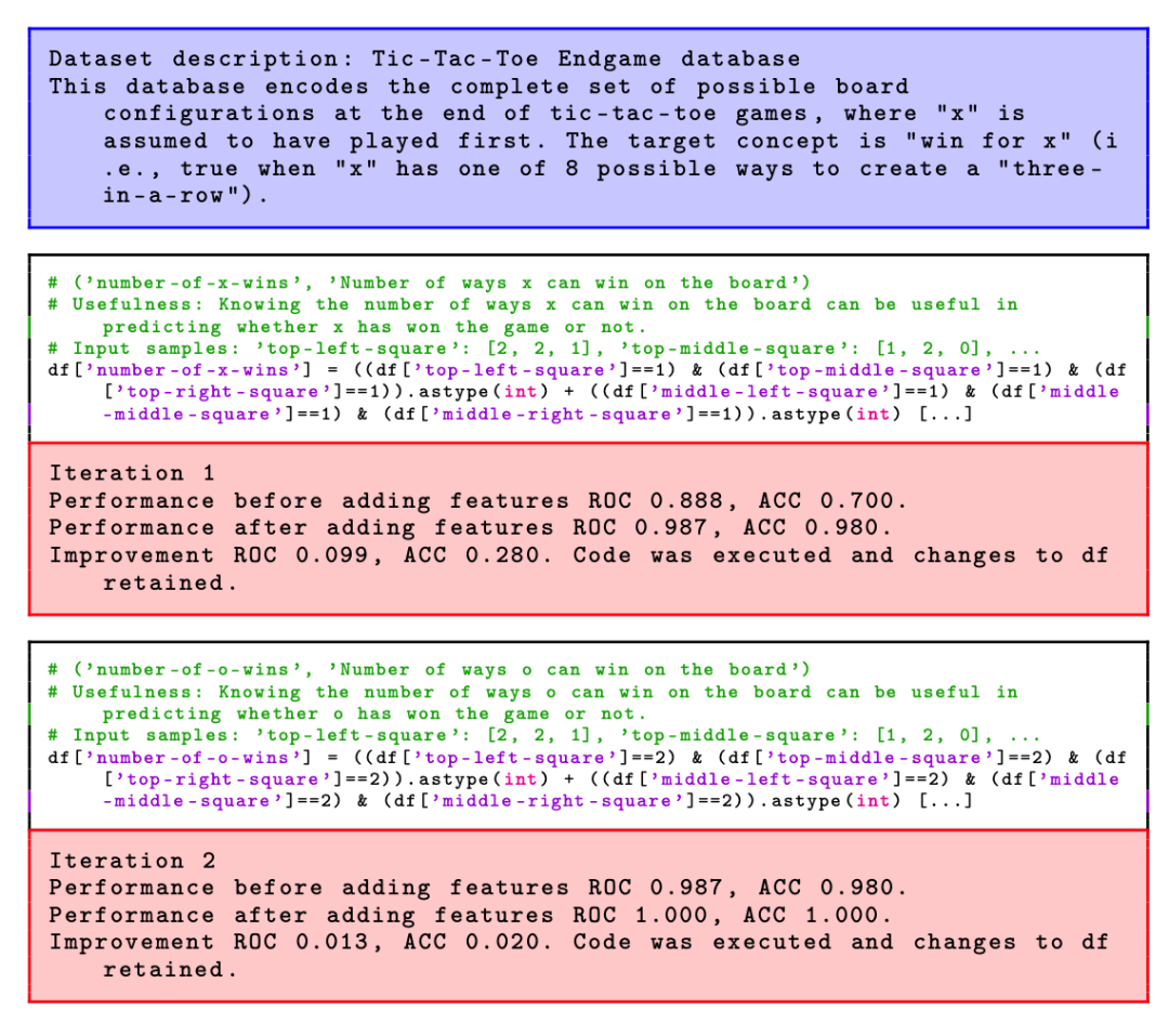 在每次迭代中,LLMs生成代码,然后在当前的和上执行,生成变换后的数据集和。然后,我们使用来拟合一个传统的ML分类器,并在上评估其性能。如果超过了在上训练并在上评估的性能,则保留该特征。否则,该特征被拒绝。