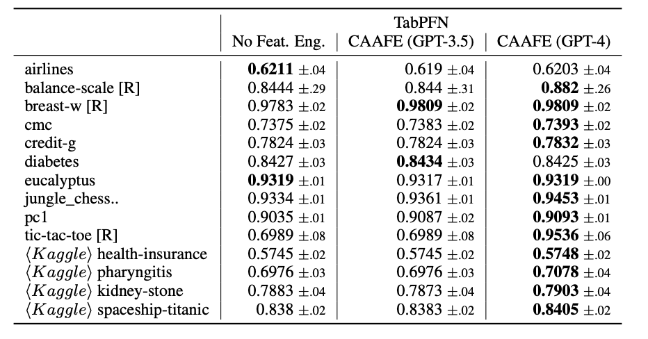 CAAFE可以显著改善其最强分类器TabPFN的性能,从平均ROC AUC为0.798提高到0.822。作者还指出,CAAFE对11/14个数据集的性能都有所提升。在新的Kaggle数据集上,CAAFE也取得了显著的改进。作者还表明,CAAFE使用GPT-4比使用GPT-3.5获得更好的性能。