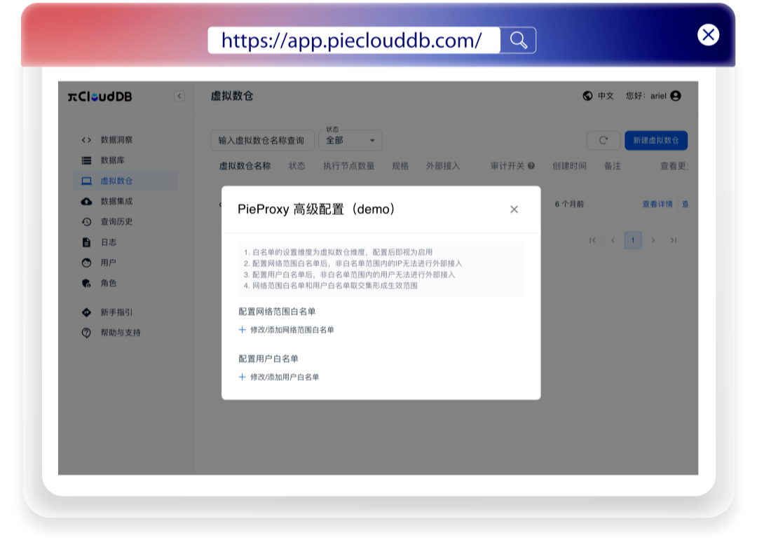PieCloudDB 云上云版支持在外部连接工具 PieProxy 上配置 IP 白名单和用户白名单,来限制外部接入功能的访问范围。IP 白名单和用户白名单将取交集形成生效范围。