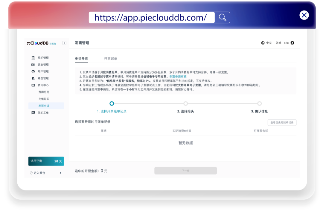 PieCloudDB 云上云版费用中心升级。组织账户区分了赠送金额和充值金额,并支持发票功能。