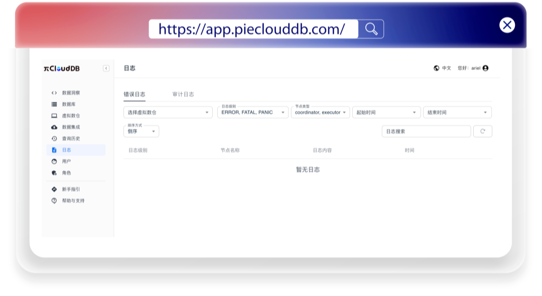 PieCloudDB 云上云版新增审计日志功能。查看审计日志需要管理员先在虚拟数仓列表中开启「审计开关」。同时,审计日志和错误日志一起集成了「日志」功能,管理员在左侧菜单点击「日志」或在虚拟数仓点击「查看日志」均可跳转。
