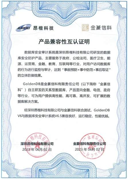 近日,GoldenDB与昂楷科技数据库安全审计系统完成产品兼容性互认证。经双方联合测试,GoldenDB与昂楷科技数据库安全审计系统兼容良好,运行稳定,满足性能和功能要求。