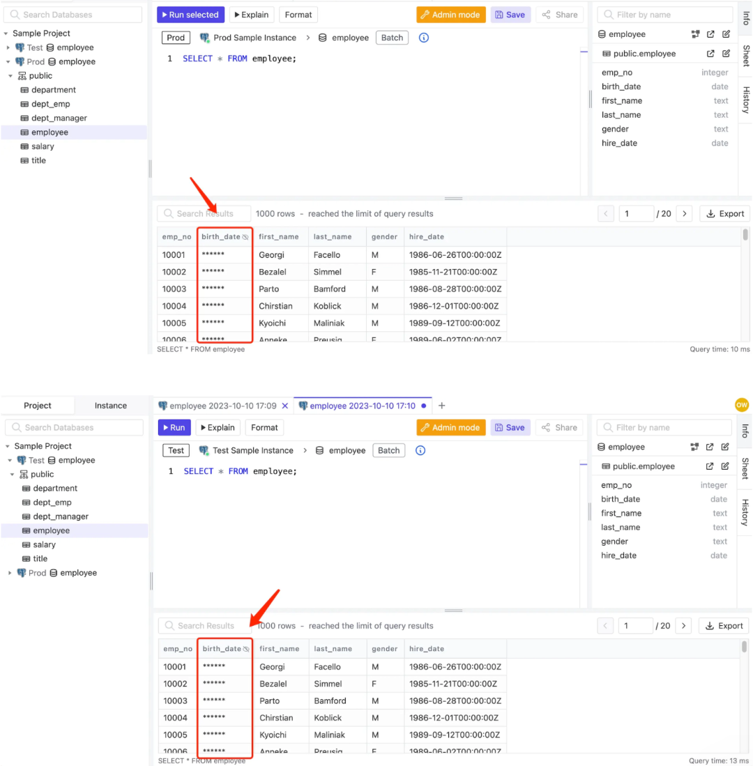 3. 返回 SQL 编辑器页面,选择 (Prod) employee > public > employee,再次运行 SELECT * FROM employee;。你会看到出生日期被脱敏了。选择 (Test) employee,结果是一样的。