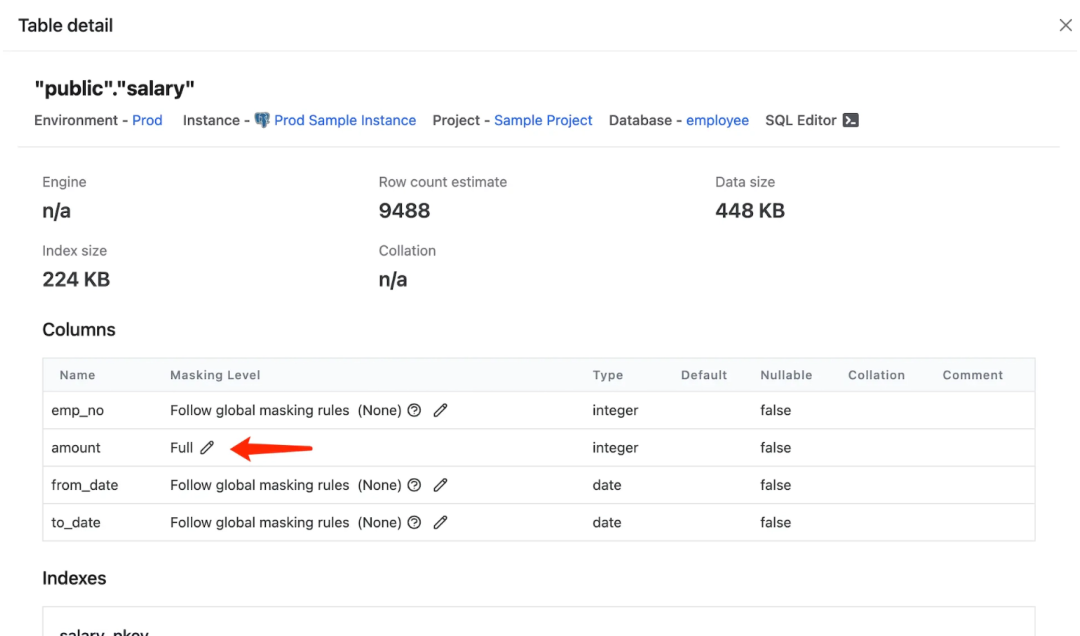 2. 单击 amount 所在行上的编辑✏️图标,然后单击全脱敏。
