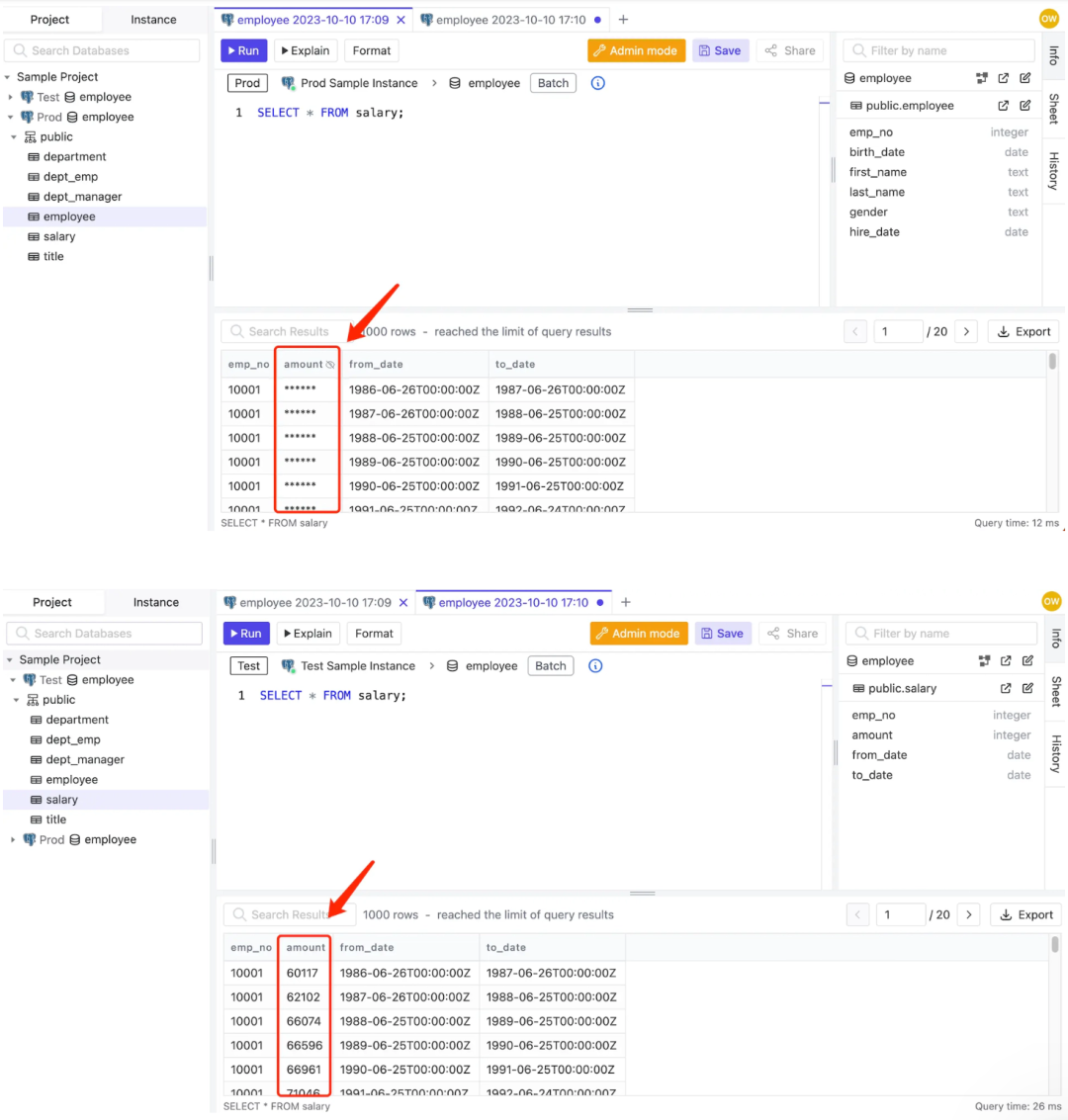 3. 返回 SQL 编辑器页面,选择 (Prod) employee > public > salary,再次运行 SELECT * FROM salary;。你会发现 amount 被脱敏了。选择 (Test) employee,则没有。