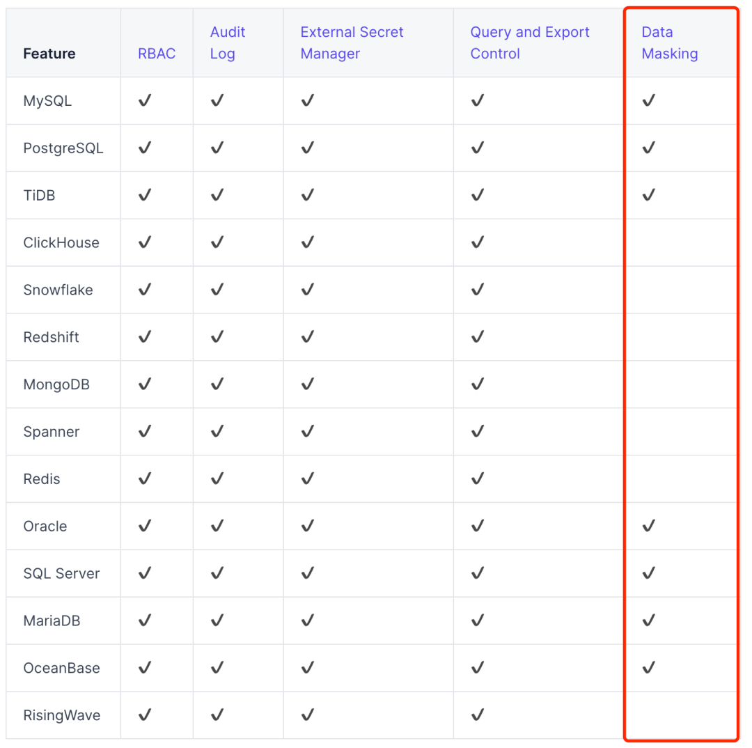 目前 Bytebase 支持以下数据库的脱敏功能 https://www.bytebase.com/docs/introduction/supported-databases/