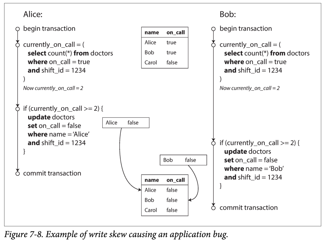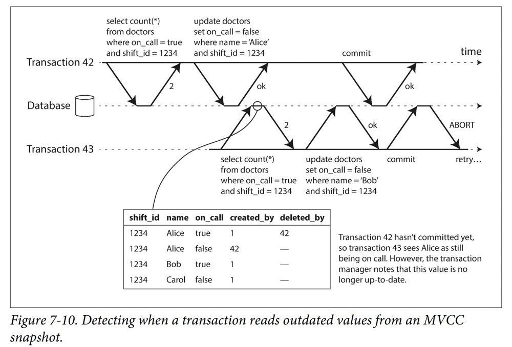 在下图中,事务 43 在查询时,认为 Alice on_call = true,但在事务 43 提交时,事务 42 已经先一步提交,并且导致 Alice on_call = false。