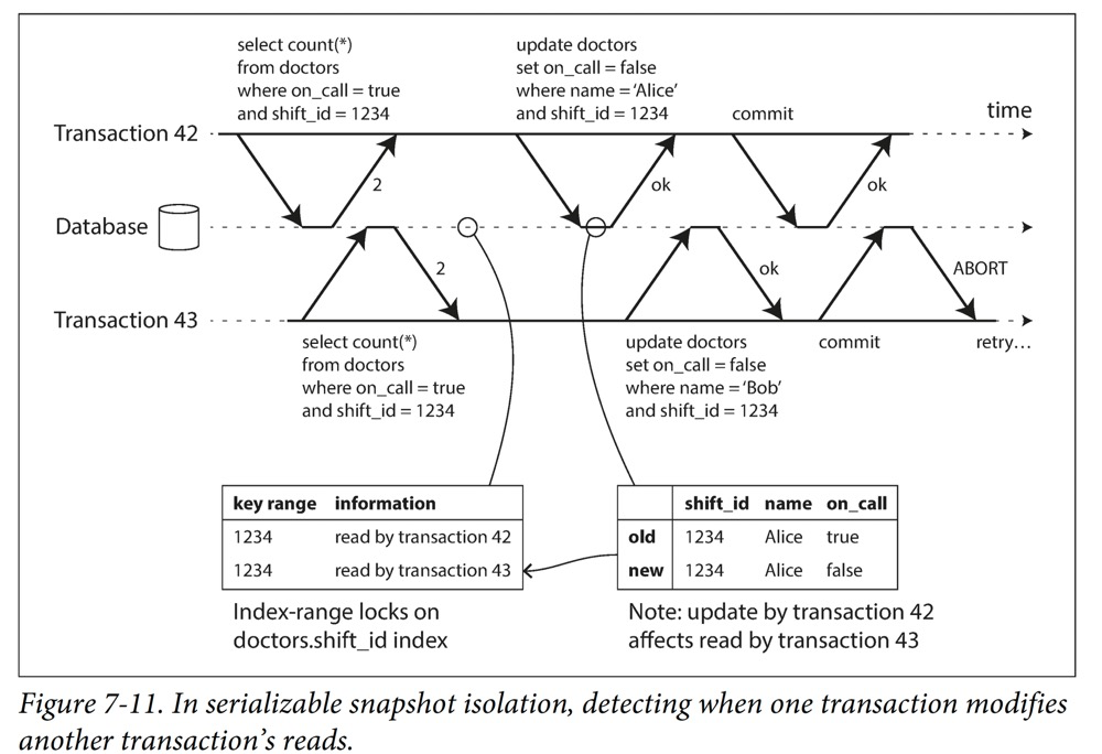 如上图,假设在班次编号 shift_id 上存在索引,事务 42、43 在读取了对应数据后,会在 shift_id = 1234 的索引条目上记下事务编号,并在事务和所有并发事务完成时,删除标记。当事务发生写入时,需要通知读过该索引的所有事务(通过标记可以知道):你读到的数据过期了。该过程类似于上锁,但并不真正的等待,而是简单通知。