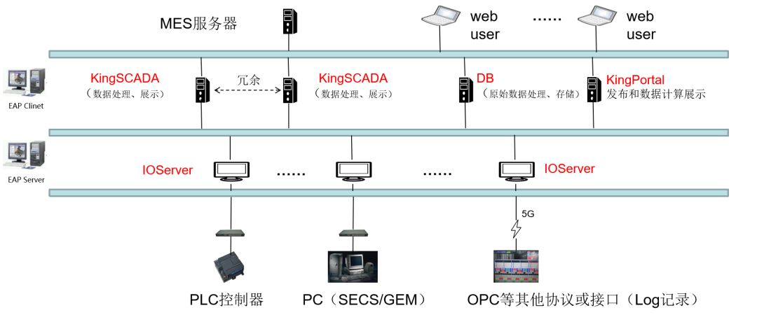 亚控电子半导体行业EAP开发平台架构分为设备层、EAP server层、EAP client层。设备层主要是电子半导体行业的各种类型机台。server层负责采集PLC类设备及SECS GEM协议或其他协议类型的设备,包括解析采集设备输出的log文件,并且server层负责对不同type机台的运维管理,机台变量点建立等。EAP cilent层负责对EAP建设功能的应用,建立与车间制造执行层MES和企业营运管理层ERP的桥梁,起到承上启下的作用。