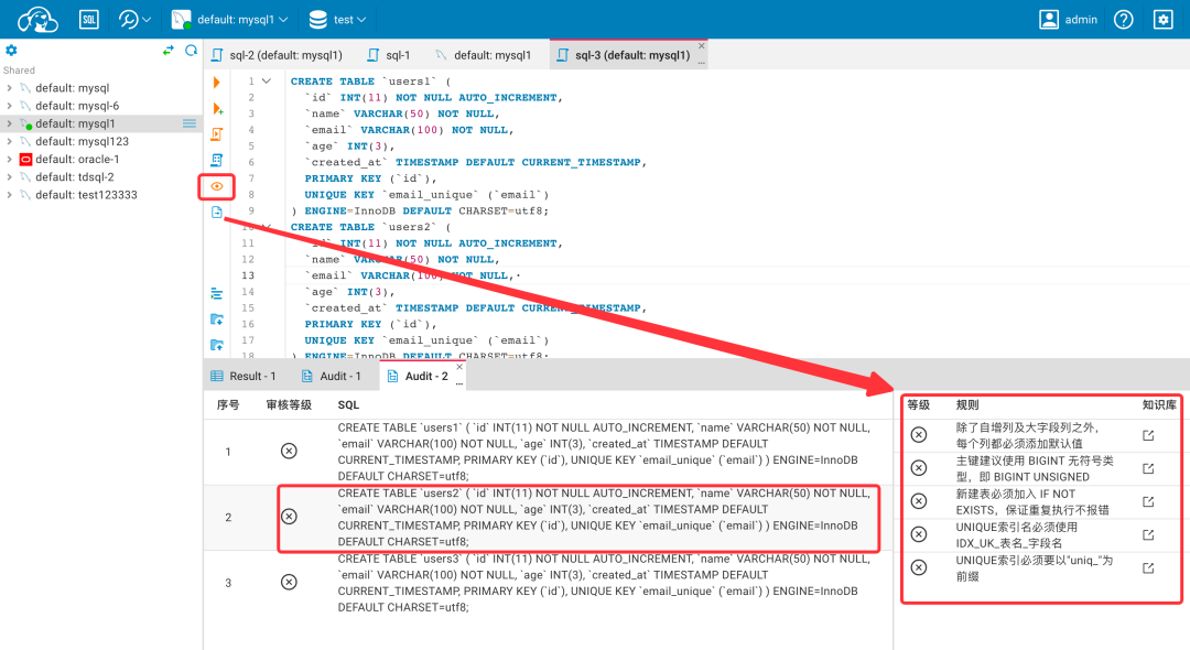 1. 输入 SQL 后,点击 SQL审核 图标,对编写的 SQL 进行规则审核,获取优化建议;
