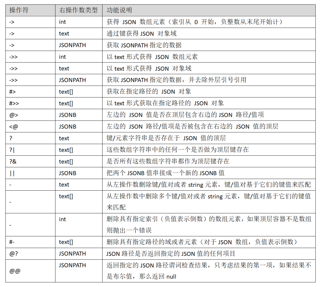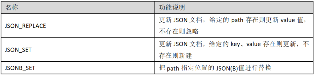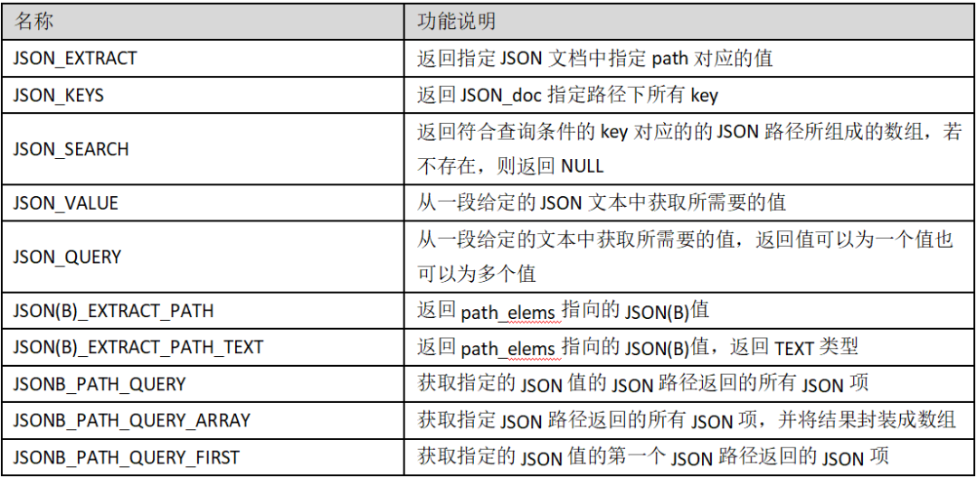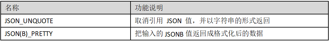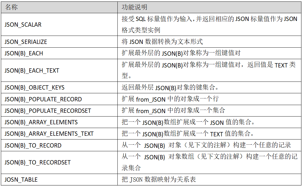 JSON的输出就是按要求去除JSON引号的引用或者格式化JSON数据,KingbaseES目前支持如下两个输出函数:聚集函数作为独立的函数,它可以实现把多个JSON数据聚集为一个JSON数据。目前KingbaseES支持的聚集函数如下表所示:我们把SQL变量和JSON变量的转化、把JSON转为字符串类型、把JSON转为行数据,或者把行数据转为JSON,以及把JSON转为关系表等函数或函数表达式统称为其转换能力。目前KingbaseES支持的转换函数如下表所示:对JSON数据,我们还可以对其进行统计、合并、比较等各种操作,我们把所有这些操作归并为其他能力,目前KingbaseES支持的其他能力函数如下表所示:上表中每个函数都实现不同的功能,这些函数都是在实际使用中必不可少的函数。