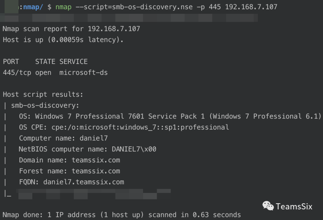 C:\Users\daniel10> nmap --script=smb-os-discovery.nse -p 445 192.168.7.107Starting Nmap 7.91 ( https://nmap.org ) at 2021-02-21 09:44 CSTNmap scan report for 192.168.7.107Host is up (0.00053s latency).PORT STATE SERVICE445/tcp open microsoft-dsHost script results:| smb-os-discovery:| OS: Windows 7 Professional 7601 Service Pack 1 (Windows 7 Professional 6.1)| OS CPE: cpe:/o:microsoft:windows_7::sp1:professional| Computer name: daniel7| NetBIOS computer name: DANIEL7\x00| Domain name: teamssix.com| Forest name: teamssix.com| FQDN: daniel7.teamssix.com|_ System time: 2021-02-21T09:44:33+08:00Nmap done: 1 IP address (1 host up) scanned in 0.50 seconds