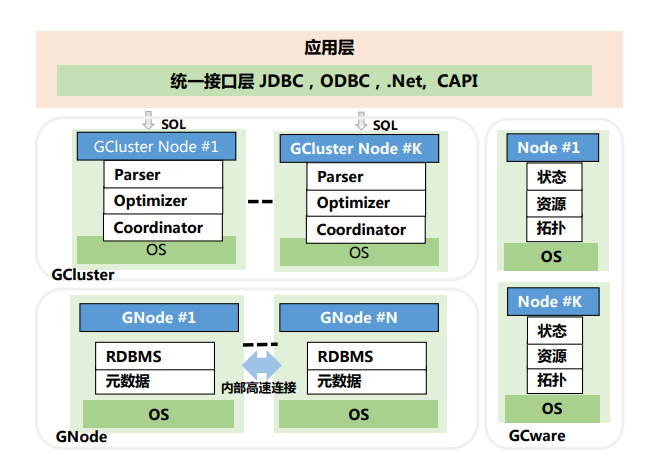 GNode 负责数据在节点上的实际存储, 并从GCluster 接收和执行经分解的 SQL 执行计划,执行结果返回给 GCluster