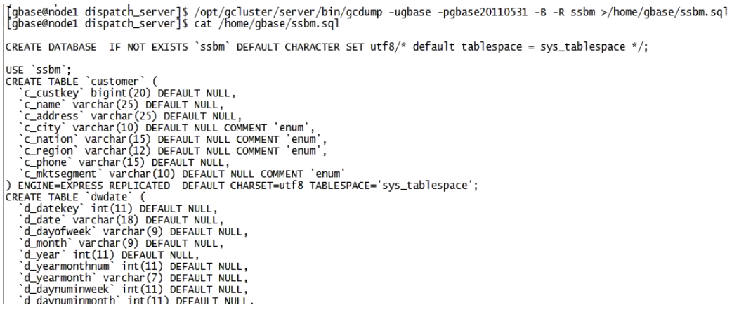 [gbase@localhost ~]$ /opt/gcluster/server/bin/gcdump -ugbase -pgbase20110531 -B -R ssbm >/home/gbase/ssbm.sql