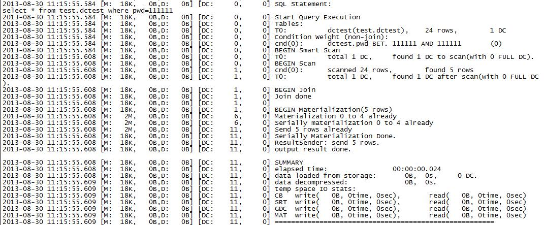 smart scan -> scan -> join -> aggregation -> sort ->materialization -> send result trace记录很长,经验是找出两个步骤之间执行时间最长的那个步骤,就是要定位的问题所在。