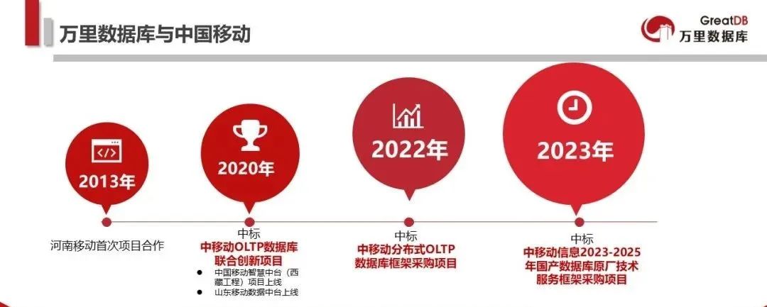 2020年后,万里数据库与中国移动合作步伐进一步加快,公司先后中标中移动OLTP数据库联合创新项目、中移动分布式OLTP数据库框架采购项目、中移动信息2023-2025年国产数据库原厂技术服务框架采购项目,服务于中移信息总部、山东、河北、湖南、宁夏、甘肃、四川、内蒙、南方基地等10余个省市分公司近百个业务系统,在项目中开展GreatDB安全数据库的安装部署、应用联调、性能调优、系统上线、运维保障等全生命周期工作,以落地可行的实践与解决方案助力中国移动集团总部及下辖多个省市分公司核心、重点业务系统实施了数据库国产化替代工作,为中国移动构建5G时代的数字智能运营商提供安全稳定、专业高效、易用便捷的全方位数据库技术支撑与服务体系保障。