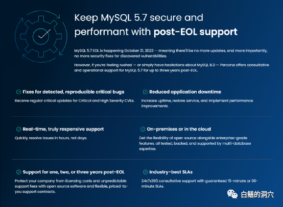 面对MySQL 5.7 EOL这个事件,percona官方宣布了付费支持的计划,在EOL之后的三年内,percona会为需要服务的客户提供收费服务支持。不过支持的力度如何,是否承诺对安全问题发布补丁不得而知。