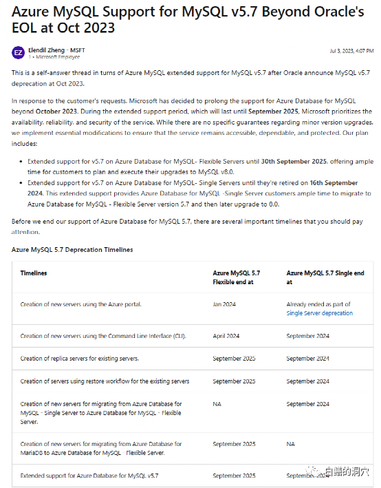 云厂商则纷纷发布了延长服务的声明,微软Azure将会在MySQL 5.7 EOL之后,为其公有云用户提供延长的服务,由Azure官方提供支持,最晚到2025年。
