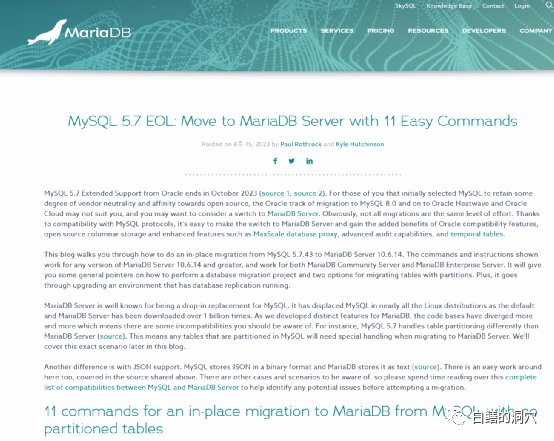 MariaDB一贯的对MySQL持有敌意,他们希望MySQL 5.7用户不要升级MySQL 8了,而是通过11条简单的命令迁移到MariaDB上去。除此之外,一些云厂商也纷纷提出了解决方案。
