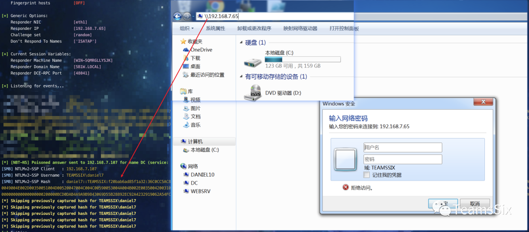 开启监听后,当目标主机上有人访问 Responder 主机的共享目录时,就会看到对方的 Net-NTLM 哈希值了。