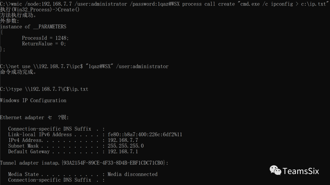 net use \\192.168.7.7\ipc$ "1qaz@WSX" /user:administratorwmic /node:192.168.7.7 process call create "cmd.exe /c ipconfig >c:\ip.txt"type \\192.168.7.7\C$\ip.txt